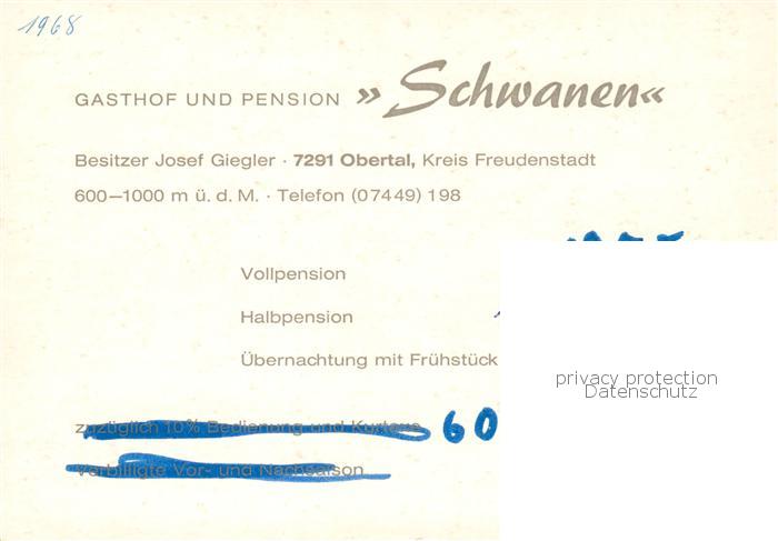 73858797 Obertal Baiersbronn Gasthof Pension Schwanen postalisch nicht gelaufen Werbekarte (keine Postkarte) Erhaltung siehe scans [FriedD77] KatCode: 11110008237004
