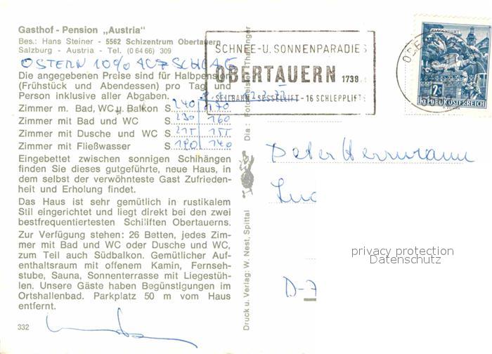 72875073 alte Postkarte Obertauern Gasthof Pension Austria Schizentrum Alpen postalisch gelaufen Erhaltung siehe scans [FriedD77] KatCode: 11390322050422