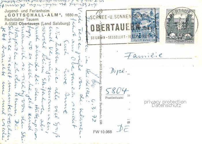72667006 alte Postkarte Obertauern Gottschall-Alm postalisch gelaufen Erhaltung siehe scans [LiesaD40] KatCode: 11390322050422