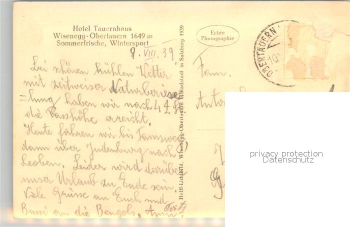 43093419 alte Postkarte Obertauern Hotel Tauernhaus Wisenegg postalisch gelaufen Erhaltung siehe scans [WerneD78] KatCode: 11390322050422