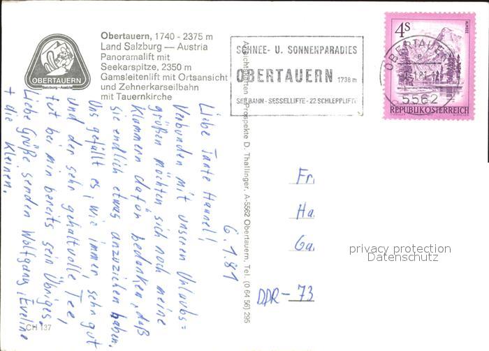 72543497 alte Postkarte Obertauern mit Seekarspitze Gamsleitenlift Zehnerkarseilbahn Tauernkirche postalisch gelaufen Erhaltung siehe scans [WerneD78 kv016box] KatCode: 11390322050422