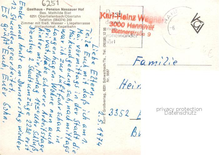 73852514 alte Postkarte Obertiefenbach Taunus Gasthaus Pension Nassauer Hof Gaststube Hirsch Seeweiher postalisch gelaufen Erhaltung siehe scans [WerneD78] KatCode: 11110007141104