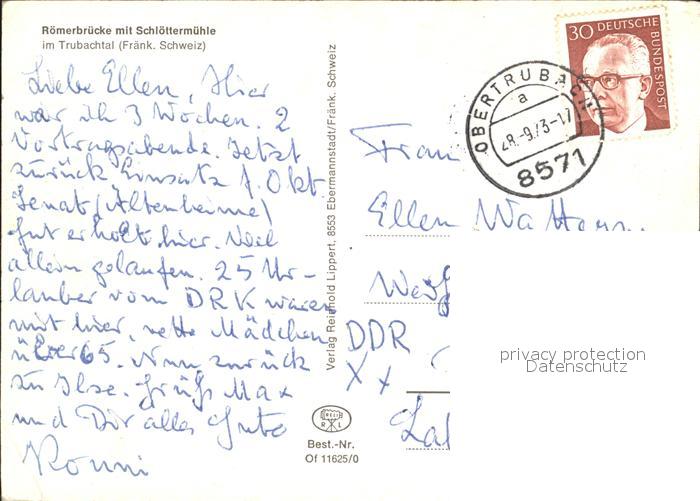 72366049 alte Postkarte Obertrubach Roemerbruecke mit Schloettermuehle Trubachtal postalisch gelaufen Erhaltung siehe scans KatCode: 11110009474156
