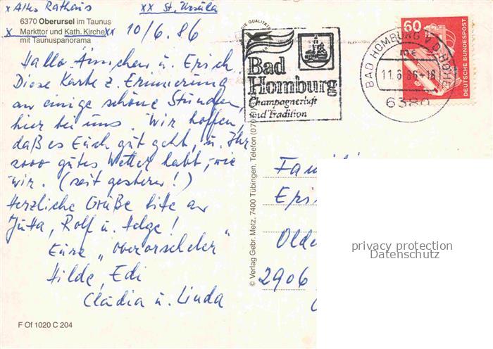 74154840 alte Postkarte Oberursel Taunus Hessen Markttor und kath Kirche mit Taunusblick postalisch gelaufen Erhaltung siehe scans [WerneD78] KatCode: 11110006434008