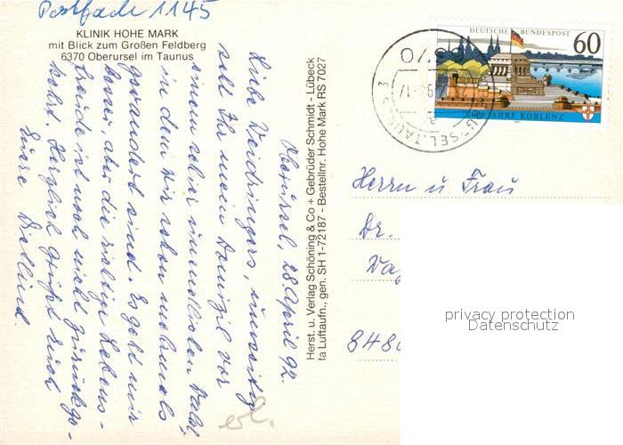 73043185 alte Postkarte Oberursel Taunus Klinik Hohe Mark mit Blick zum Grossen Feldberg Fliegeraufnahme postalisch gelaufen Erhaltung siehe scans [FriedD77] KatCode: 11110006434008