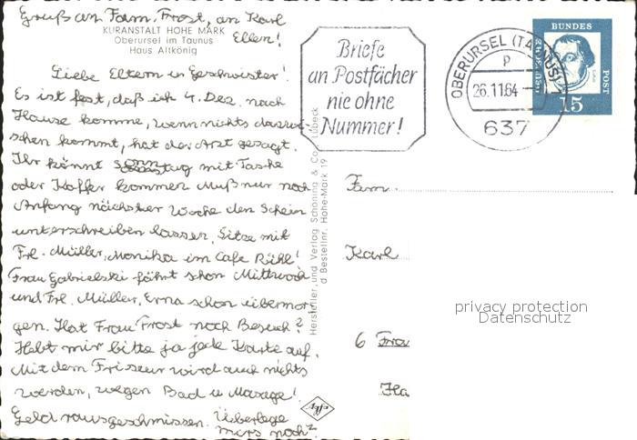 72100741 alte Postkarte Oberursel Taunus Kuranstalt Hohe Mark postalisch gelaufen Erhaltung siehe scans KatCode: 11110006434008