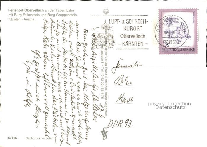 72375451 alte Postkarte Obervellach Kaernten Ferienort Tauernbahn Burg Falkenstein Groppenstein Alpenpanorama postalisch gelaufen Erhaltung siehe scans KatCode: 11390212020627