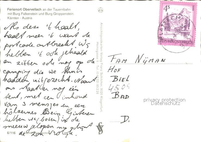 72094878 alte Postkarte Obervellach Kaernten Totalansicht Burg Falkenstein und Burg Groppenstein postalisch gelaufen KatCode: 11390212020627