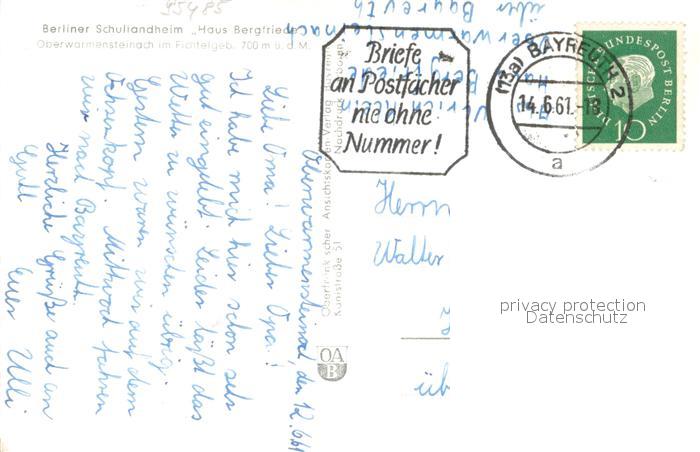 73648248 alte Postkarte Oberwarmensteinach Berliner Schullandheim Haus Bergfriede postalisch gelaufen Erhaltung siehe scans [WerneD78] KatCode: 11110009472198