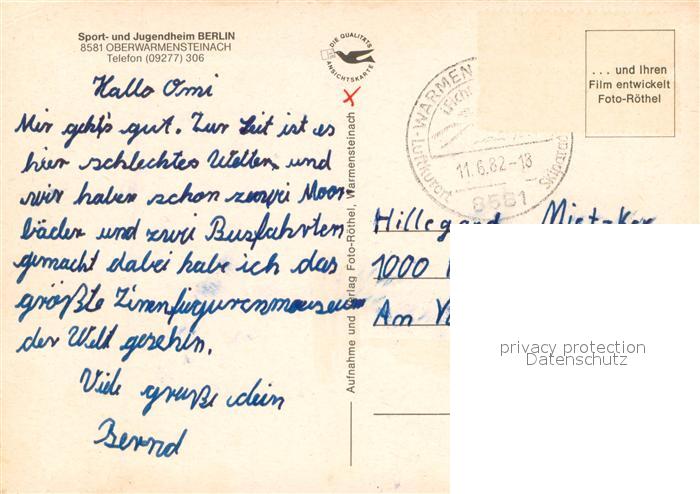 73645220 alte Postkarte Oberwarmensteinach Sport und Jugendheim Berlin Gastraum Panorama postalisch gelaufen Erhaltung siehe scans [WerneD78] KatCode: 11110009472198