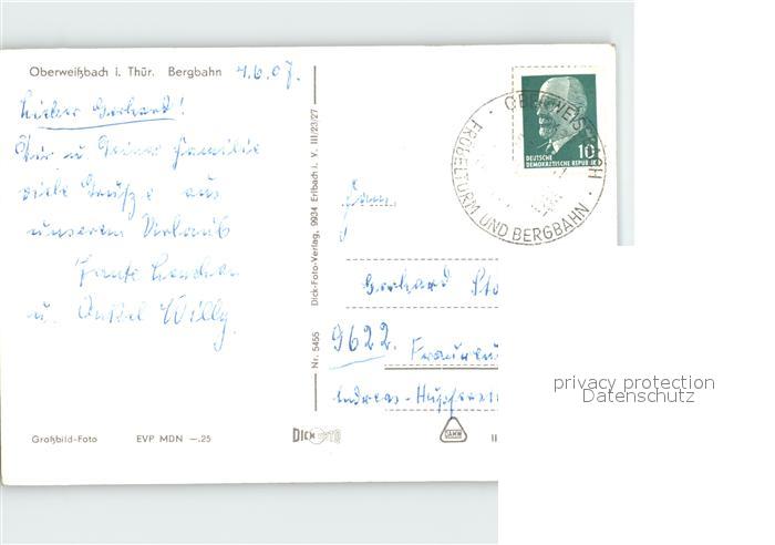 72362060 alte Postkarte Oberweissbach Bergbahn postalisch gelaufen Erhaltung siehe scans KatCode: 11110016073065