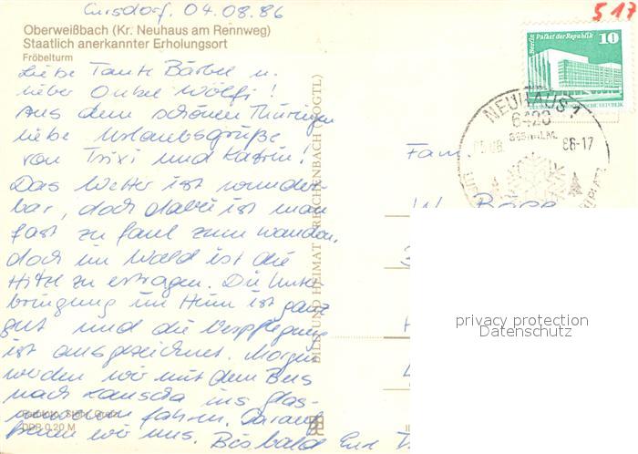 73652174 alte Postkarte Oberweissbach Froebelturm postalisch gelaufen Erhaltung siehe scans [WerneD78] KatCode: 11110016073065