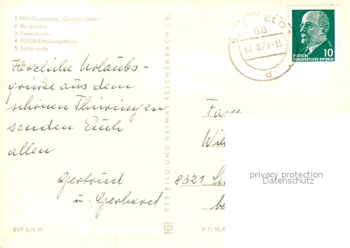 72637103 alte Postkarte Oberweissbach Gaststaette Central Cafe Bergbahn Froebelturm Erholungsheim Teilansicht postalisch gelaufen Erhaltung siehe scans [AndreD76] KatCode: 11110016073065