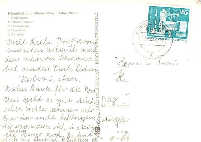 73924711 alte Postkarte Oberweissbach Thueringen Panorama Froebelturm Lichtenhain Deesbach Cursdorf postalisch gelaufen Erhaltung siehe scans [FriedD77] KatCode: 11110016073065