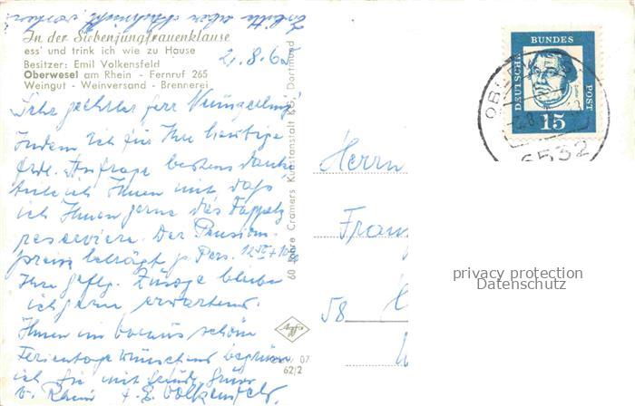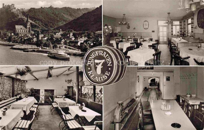 74095058 alte Postkarte Oberwesel Rhein Jungfrauen Klause Gastraeume Kegelbahn Ortsansicht mit Kirche postalisch gelaufen Erhaltung siehe scans [FriedD77] KatCode: 11110007140112