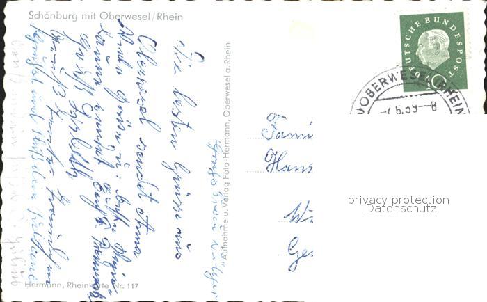 72118170 alte Postkarte Oberwesel Rhein mit Schoenburg postalisch gelaufen Erhaltung siehe scans KatCode: 11110007140112