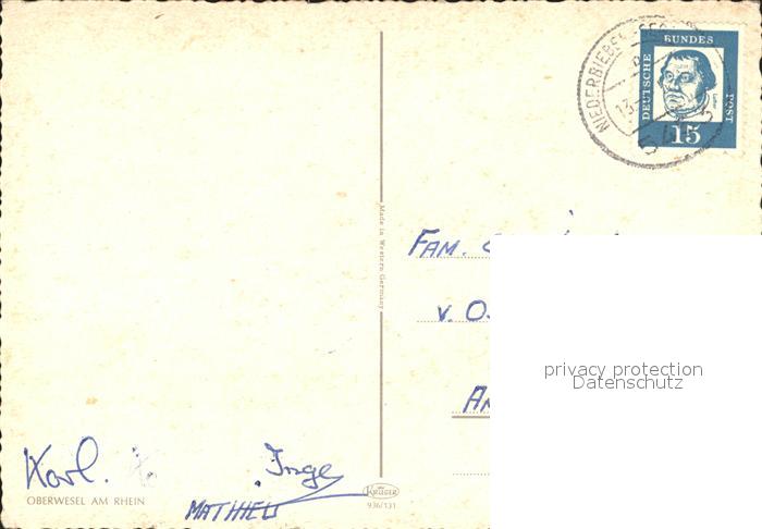 72246265 alte Postkarte Oberwesel Rhein Panorama mit Kirche postalisch gelaufen Erhaltung siehe scans KatCode: 11110007140112