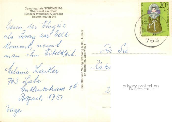 73672672 alte Postkarte Oberwesel Rhein Rheinpartie Schwimmbad Campingplatz Schoenburg postalisch gelaufen Erhaltung siehe scans [WerneD78] KatCode: 11110007140112