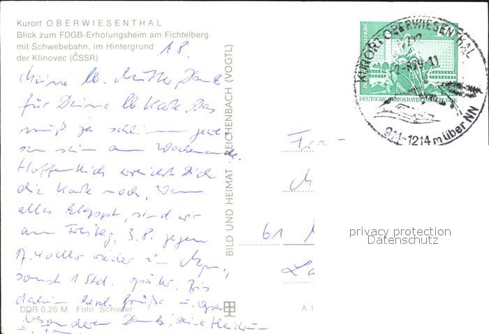 72394157 alte Postkarte Oberwiesenthal Erzgebirge FDGB Erholungsheim am Fichtelberg mit Schwebebahn postalisch gelaufen Erhaltung siehe scans KatCode: 11110014171240