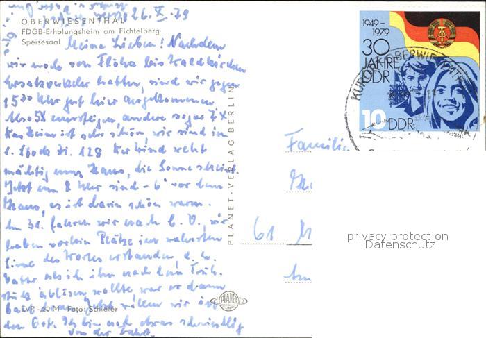 72394146 alte Postkarte Oberwiesenthal Erzgebirge FDGB Erholungsheim am Fichtelberg Speisesaal postalisch gelaufen Erhaltung siehe scans KatCode: 11110014171240