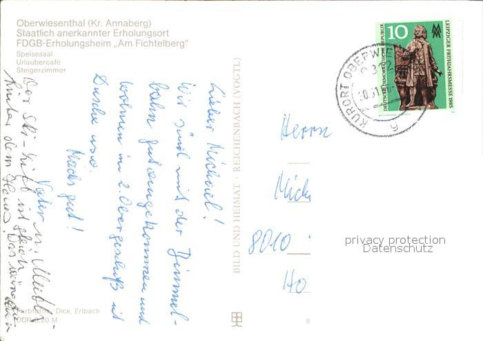 72406196 alte Postkarte Oberwiesenthal Erzgebirge FDGB Erholungsheim Am Fichtelberg Speisesaal Urlaubercafe Steigerzimmer postalisch gelaufen Erhaltung siehe scans KatCode: 11110014171240