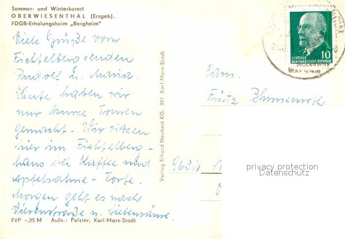 72925123 alte Postkarte Oberwiesenthal Erzgebirge FDGB Erholungsheim Bergheim postalisch gelaufen Erhaltung siehe scans [WerneD78] KatCode: 11110014171240