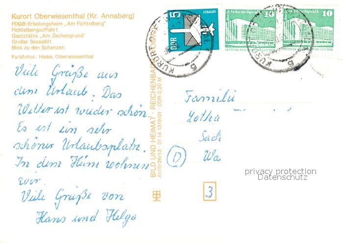 73064573 alte Postkarte Oberwiesenthal Erzgebirge FDGB Erholungsheim Fichtelberg Gaststaette am Zechengrund Gr Sessellift Sprungschanzen postalisch gelaufen Erhaltung siehe scans [FriedD77] KatCode: 11110014171240