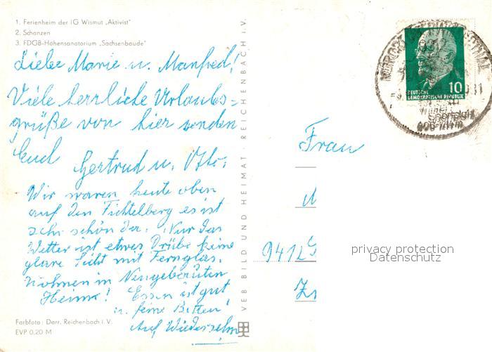 73145115 alte Postkarte Oberwiesenthal Erzgebirge Ferienheim der IG Wismut Aktivist Schanzen FDGB Sanatorium Sachsenbaude postalisch gelaufen Erhaltung siehe scans [FriedD77] KatCode: 11110014171240