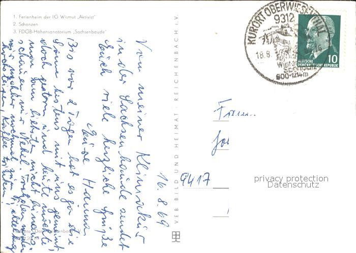 72424089 alte Postkarte Oberwiesenthal Erzgebirge Ferienheim der IG Wismut Aktivist Schanzen Hoehensanatorium Sachsenbaude postalisch gelaufen Erhaltung siehe scans KatCode: 11110014171240