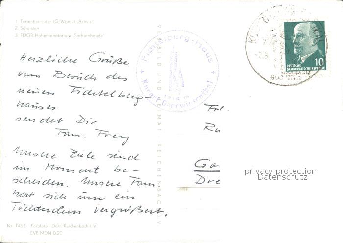 72261147 alte Postkarte Oberwiesenthal Erzgebirge Ferienheim der IG Wismut Aktivist Sprungschanze FDGB Sanatorium Sachsenbaude postalisch gelaufen Erhaltung siehe scans KatCode: 11110014171240