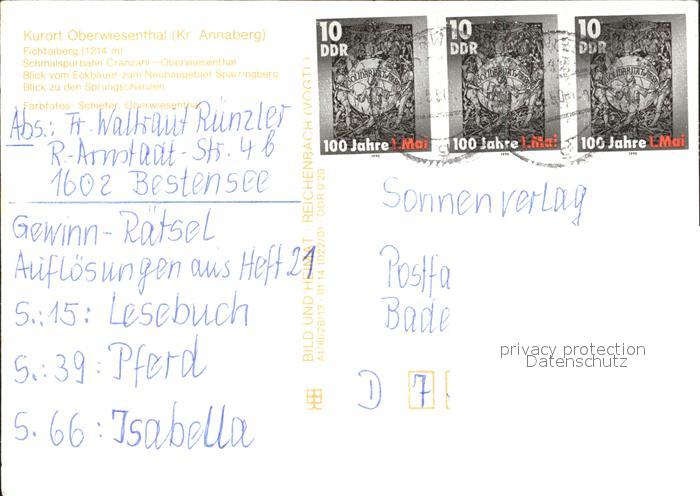 72378345 alte Postkarte Oberwiesenthal Erzgebirge Fichtelberg Schmalspurbahn Eckbauer Neubaugebiet Sparringberg Sprungschanzen postalisch gelaufen Erhaltung siehe scans KatCode: 11110014171240