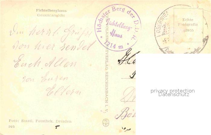 72647208 alte Postkarte Oberwiesenthal Erzgebirge Fichtelberghaus postalisch gelaufen Erhaltung siehe scans [NatalD47] KatCode: 11110014171240