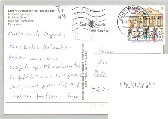 73840568 alte Postkarte Oberwiesenthal Erzgebirge Fichtelbergschanze Freilichtbuehne Stadtkirche Panorama postalisch gelaufen Erhaltung siehe scans [WerneD78] KatCode: 11110014171240