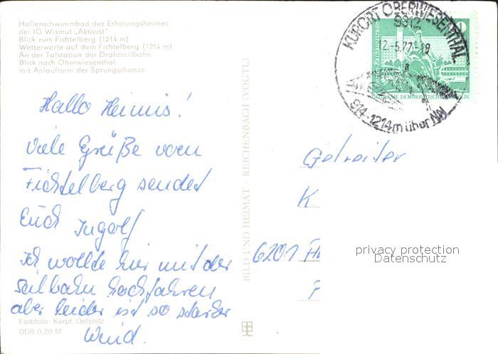 72557362 alte Postkarte Oberwiesenthal Erzgebirge Hallenschwimmbad Erholungsheim IG Wismut Aktivist Fichtelberg postalisch gelaufen Erhaltung siehe scans [KathaD79] KatCode: 11110014171240
