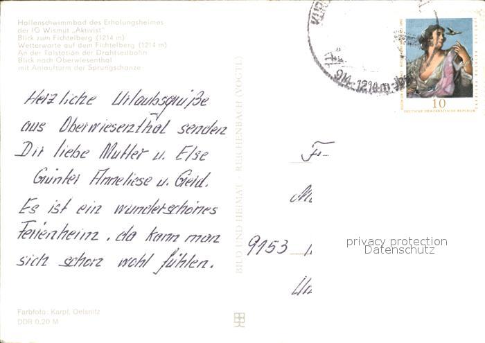 72375068 alte Postkarte Oberwiesenthal Erzgebirge Hallenschwimmbad Fichtelberg Wetterwarte Talstation der Drahtseilbahn Sprungschanze postalisch gelaufen Erhaltung siehe scans KatCode: 11110014171240