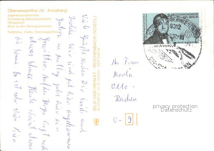 72372277 alte Postkarte Oberwiesenthal Erzgebirge Jugendtouristenhotel Fichtelberg Seilschwebebahn Sprungschanzen Pferdekutschenfahrt postalisch gelaufen Erhaltung siehe scans KatCode: 11110014171240