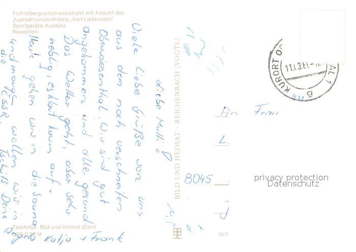 73742364 alte Postkarte Oberwiesenthal Erzgebirge Jugendtouristenhotel Karl Liebknecht Sportgeraete Ausleihe Rezeption Seilbahn postalisch gelaufen Erhaltung siehe scans [WerneD78] KatCode: 11110014171240