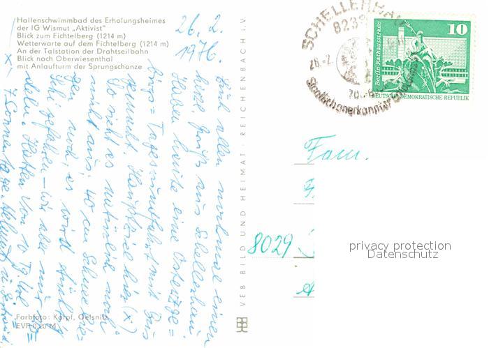 72630521 alte Postkarte Oberwiesenthal Erzgebirge Kallenschwimmbad Fichtelberg Wetterwarte Sprungschanze postalisch gelaufen Erhaltung siehe scans [LiesaD40] KatCode: 11110014171240