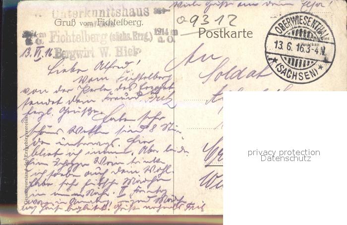 42295742 alte Postkarte Oberwiesenthal Erzgebirge mit Fichtelberg Unterkunftshaus postalisch gelaufen Feldpost Erhaltung siehe scans KatCode: 11110014171240