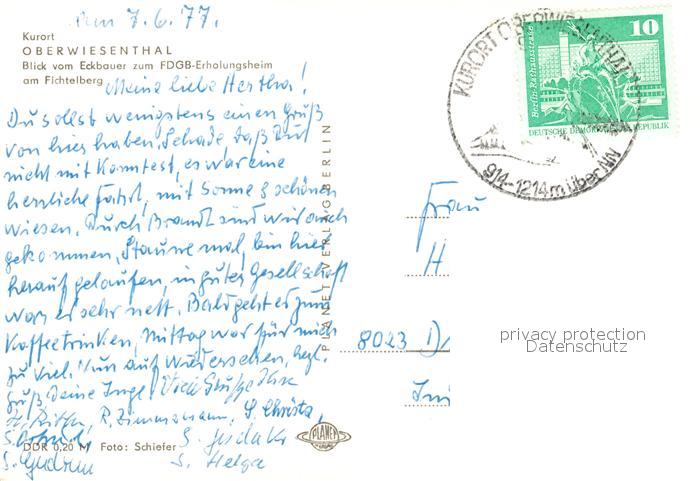 73271470 alte Postkarte Oberwiesenthal Erzgebirge Panorama Blick vom Eckbauer zum FDGB Erholungsheim am Fichtelberg postalisch gelaufen Erhaltung siehe scans [FriedD77] KatCode: 11110014171240