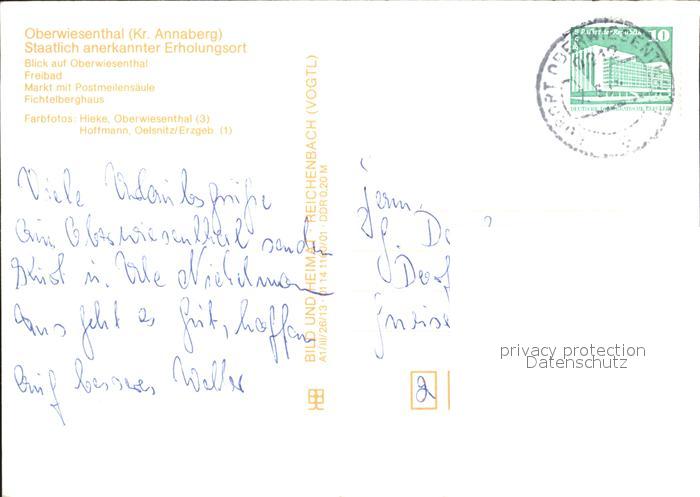 72372253 alte Postkarte Oberwiesenthal Erzgebirge Panorama Freibad Markt Postmeilensaeule Fichtelberghaus Bergbahn postalisch gelaufen Erhaltung siehe scans KatCode: 11110014171240
