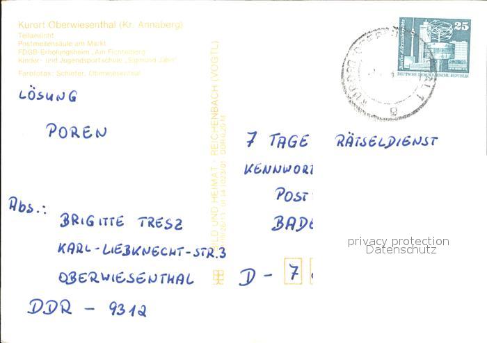 72416161 alte Postkarte Oberwiesenthal Erzgebirge Postmeilensaeule Markt FDGB Erholungsheim Fichtelberg postalisch gelaufen Erhaltung siehe scans KatCode: 11110014171240