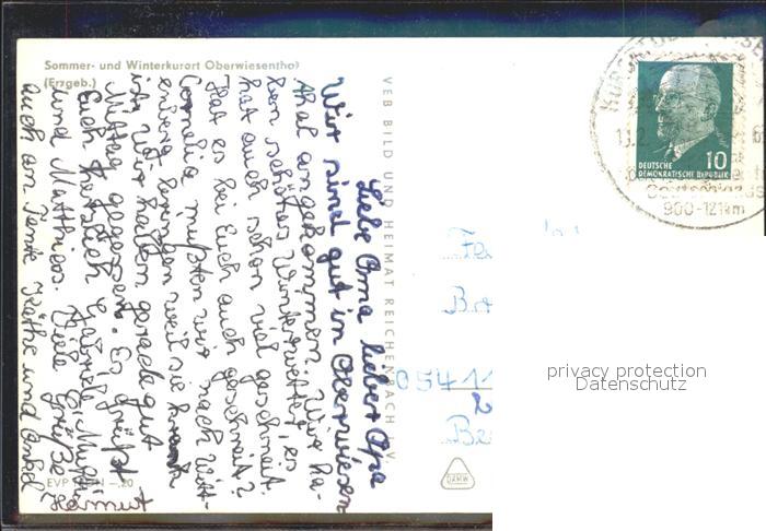 72143014 alte Postkarte Oberwiesenthal Erzgebirge Sprungschanze Meilenstein am Marktplatz Teilansicht Schwebebahn postalisch gelaufen Erhaltung siehe scans KatCode: 11110014171240