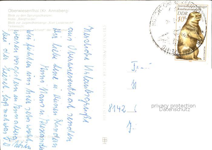 72414005 alte Postkarte Oberwiesenthal Erzgebirge Sprungschanzen Seilbahn Hotel Bergfrieden Jugendherberge Karl Liebknecht Teilansicht Erholungsheim Aktivist postalisch gelaufen Erhaltung siehe scans KatCode: 11110014171240
