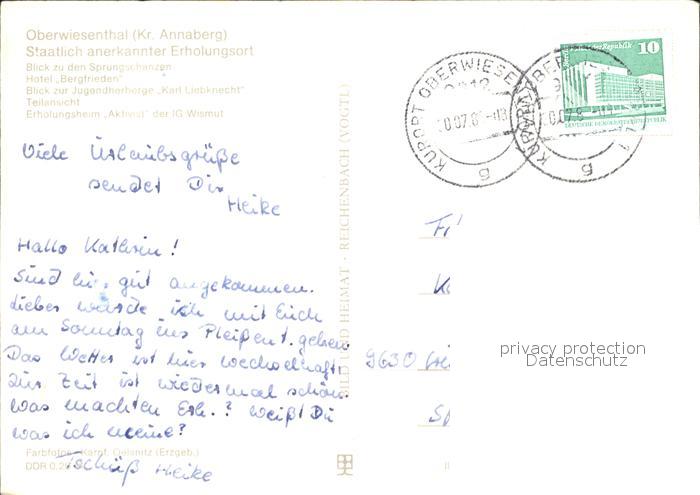72325193 alte Postkarte Oberwiesenthal Erzgebirge Sprungschanzen Seilbahn Hotel Bergfrieden Jugendherberge Karl Liebknecht Teilansicht Erholungsheim Aktivist postalisch gelaufen Erhaltung siehe scans KatCode: 11110014171240