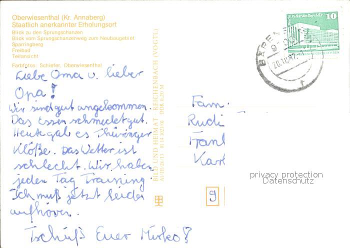 72373592 alte Postkarte Oberwiesenthal Erzgebirge Sprungschanzen Sparringberg Freibad postalisch gelaufen Erhaltung siehe scans KatCode: 11110014171240