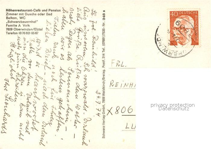 73088355 alte Postkarte Oberwinden Elztal Restaurant-Cafe Schwarzbauernhof postalisch gelaufen Erhaltung siehe scans [PaolaD17] KatCode: 11110008316055