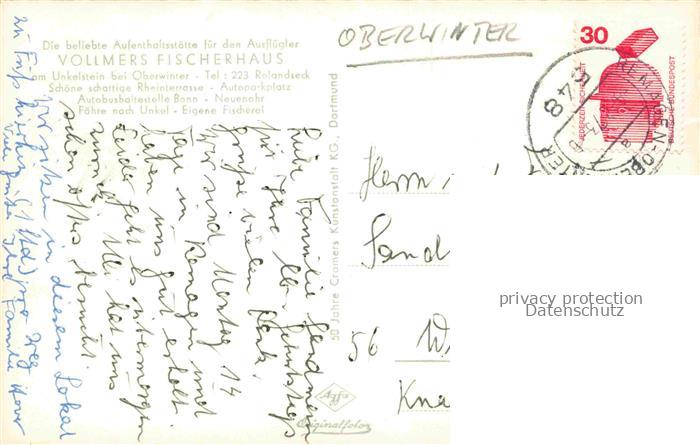 74095465 alte Postkarte Oberwinter Rhein Remagen Hotel Restaurant Vollmers Fischerhaus am Unkelstein postalisch gelaufen Fliegeraufnahme Erhaltung siehe scans [FriedD77] KatCode: 11110007131070