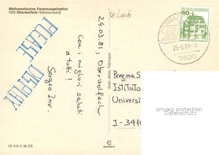 73043542 alte Postkarte Oberwolfach Mathematisches Forschungsinstitut Lehrsaal Bibliothek postalisch gelaufen Erhaltung siehe scans [FriedD77] KatCode: 11110008317093
