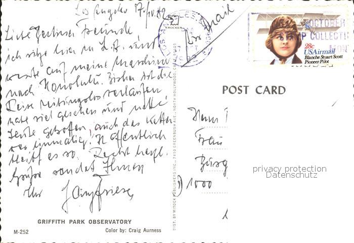 alte Postkarte Observatorium Sternwarte Urania Griffith Park Observatory Los Angeles postalisch gelaufen Erhaltung siehe scans
